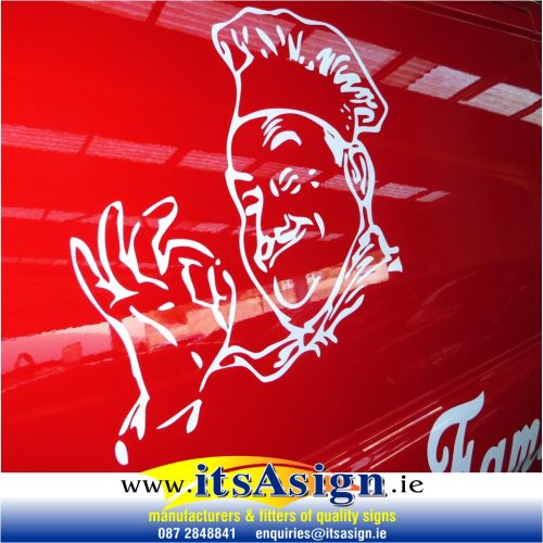 We spent a couple of days in Dundalk recently working on signage for the new van in the fleet of O'Neill's bakery! The red paintwork is a perfect background for the white text and colourful logo decals on all four sides of the new Ford vans. Instantly recognisable, shiny and brand spanking new, we completed the work whilst the vans were still in the dealership showroom so that they were ready to go immediately on collection...